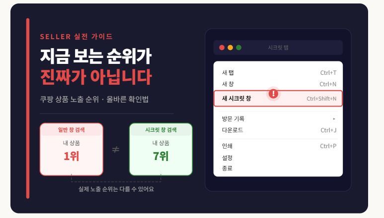 쿠팡 셀러라면 순위 확인 시 항상 시크릿 창을 기본으로 사용하는 습관을 들이시길 권장드립니다. 특히 광고 집행 여부나 키워드 전략을 조정할 때 기준이 되는 데이터가 잘못되면 판단도 틀어질 수 있기 때문입니다.